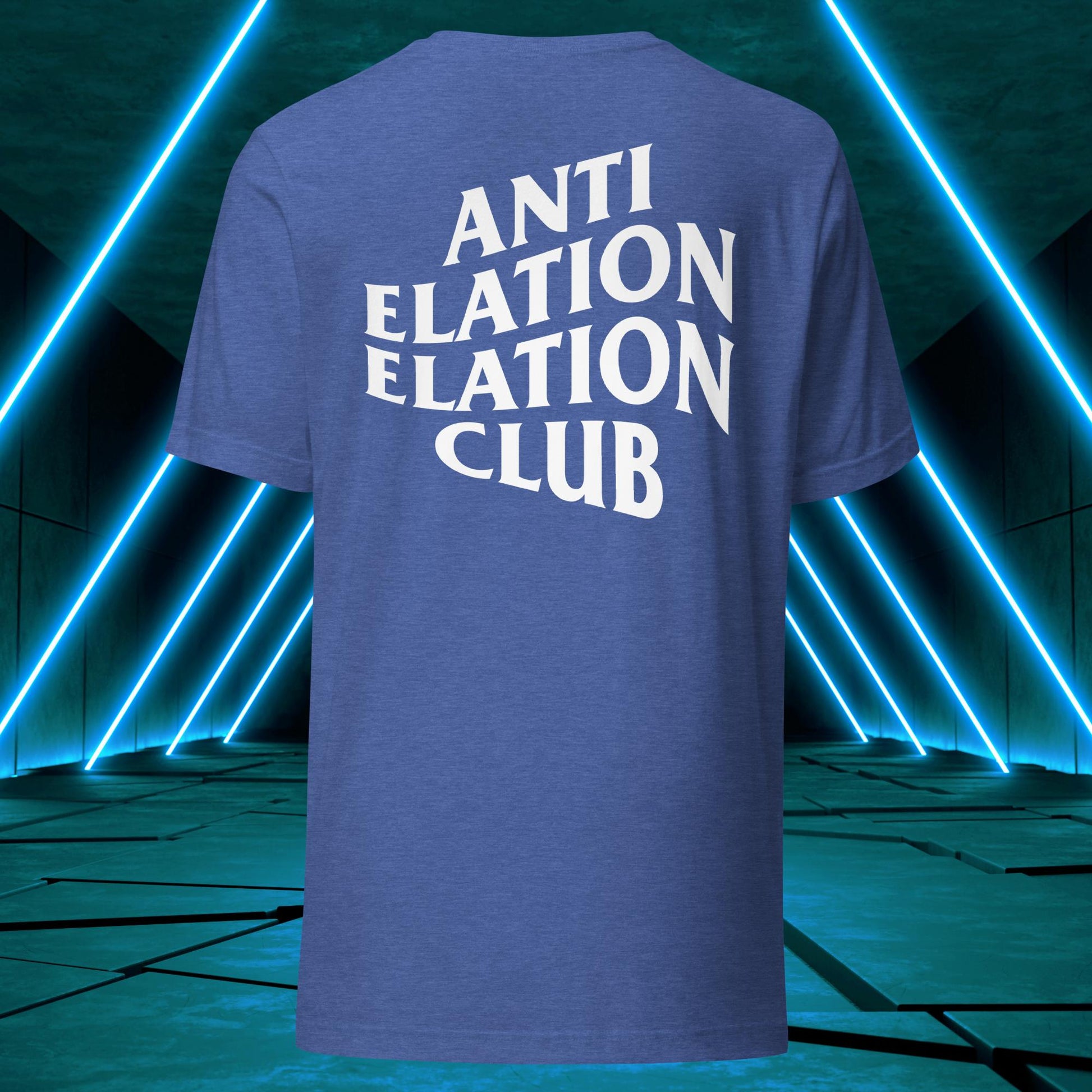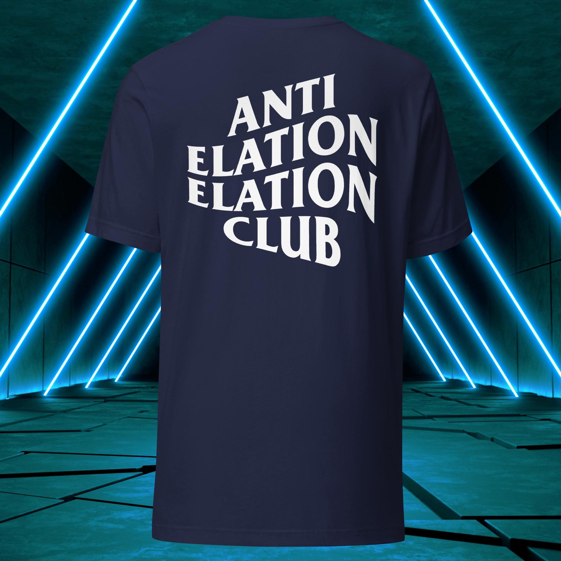 Featuring a clever play on words, this t-shirt showcases the phrase "Anti Elation Elation Club" in a clean, modern font. To Elation or not to Elation, that is the question!