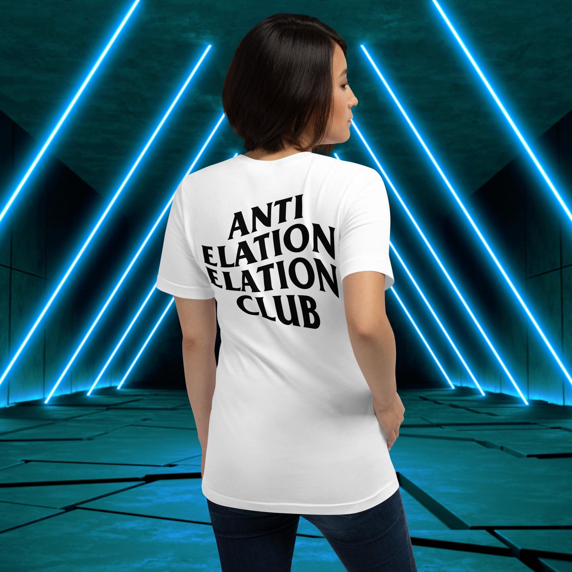 Featuring a clever play on words, this t-shirt showcases the phrase "Anti Elation Elation Club" in a clean, modern font. To Elation or not to Elation, that is the question!