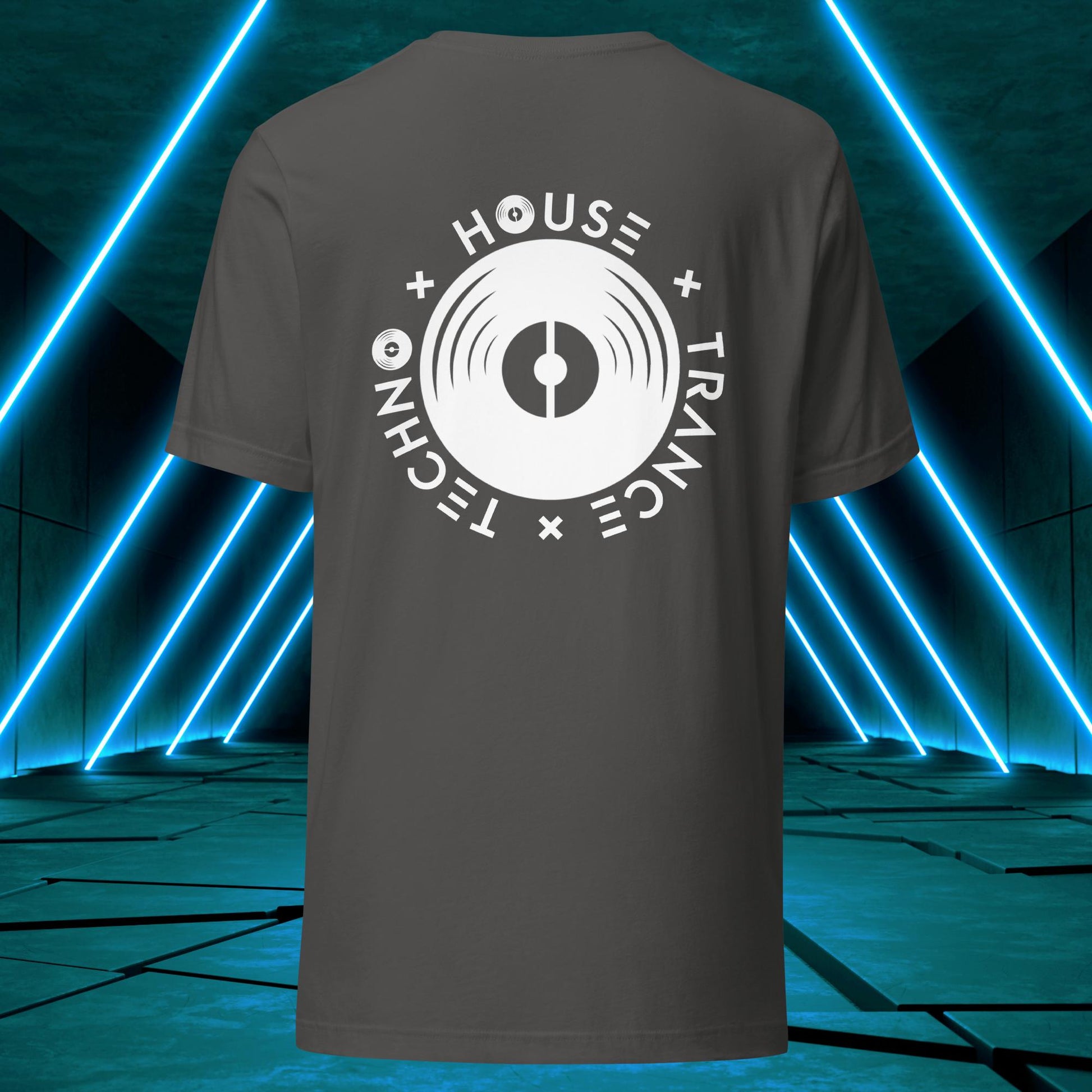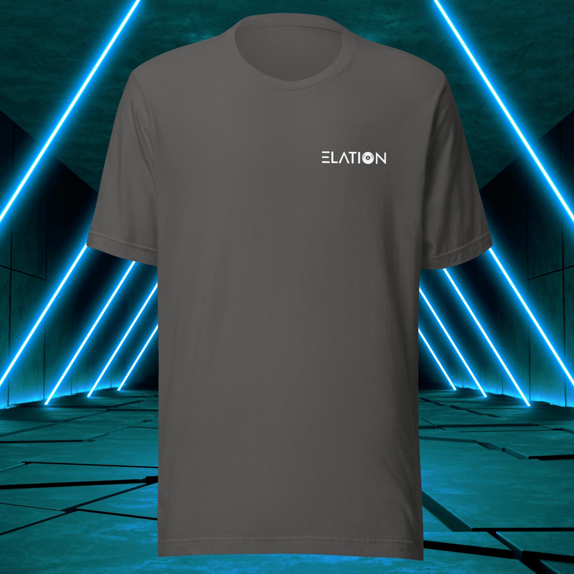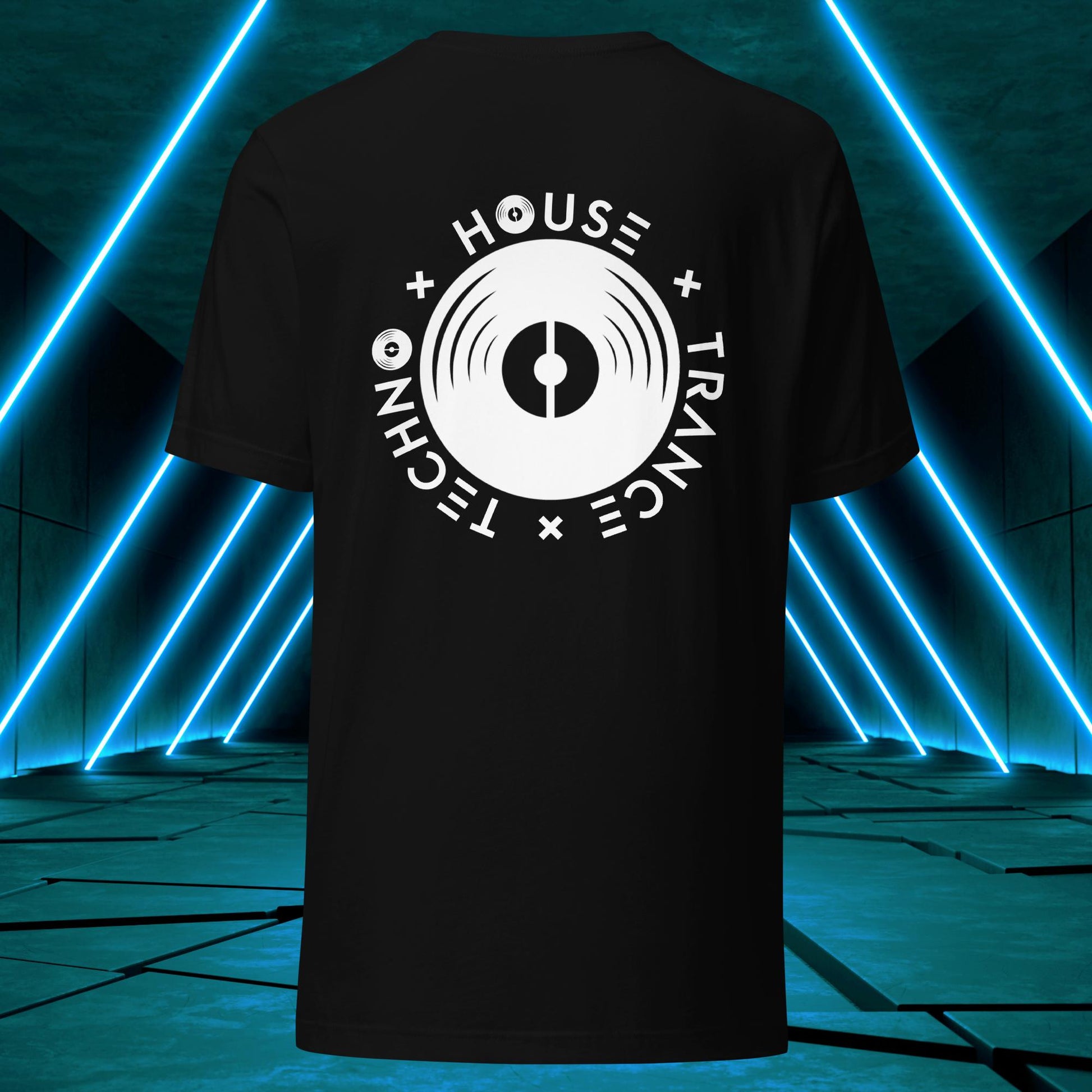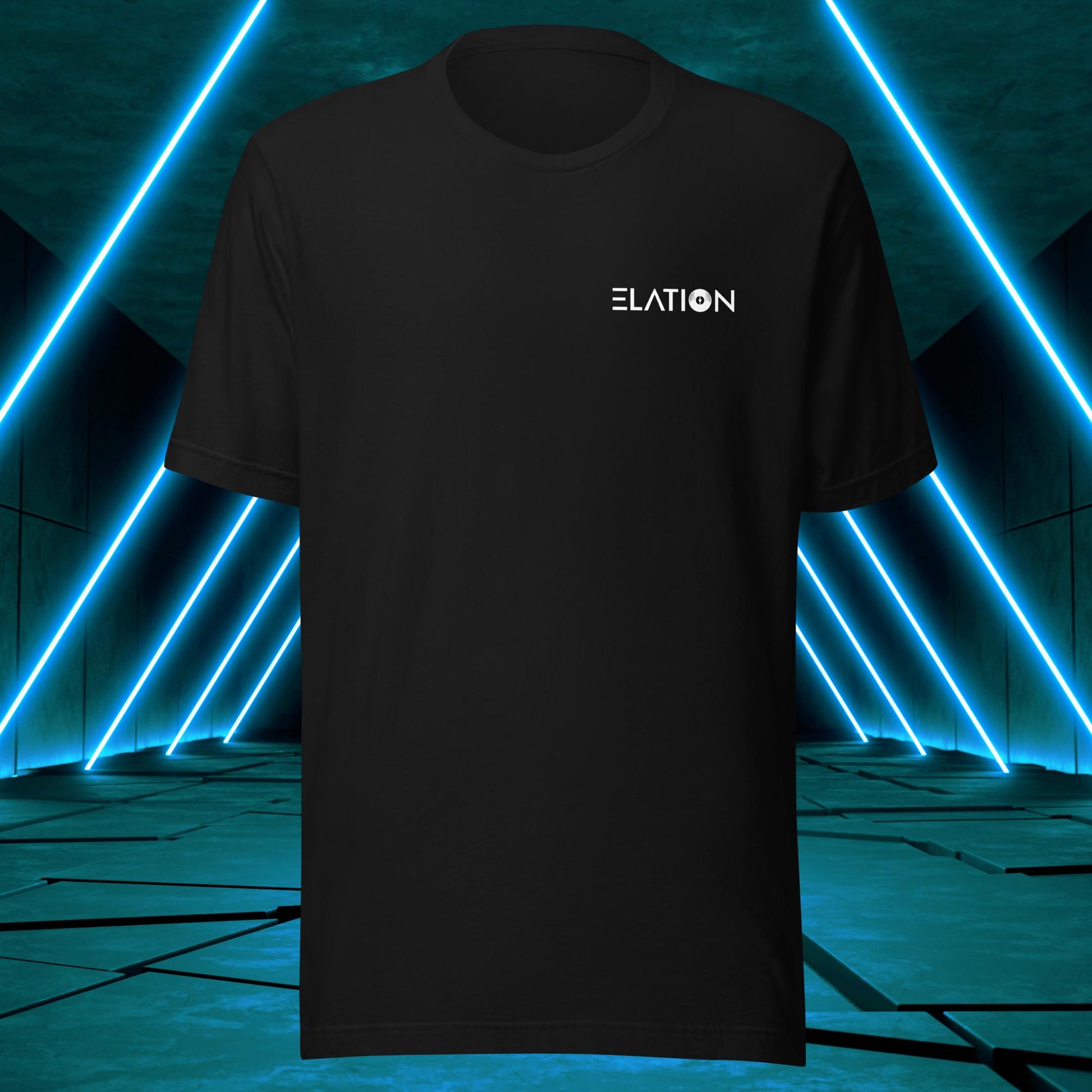 Featuring a sleek and modern design, this t-shirt showcases Elation's emblem on the back, with the words "House," "Techno," and "Trance" integrated into the design elements surrounding a vinyl disc just as one surrounds themself with such music to find wholesomeness in life!