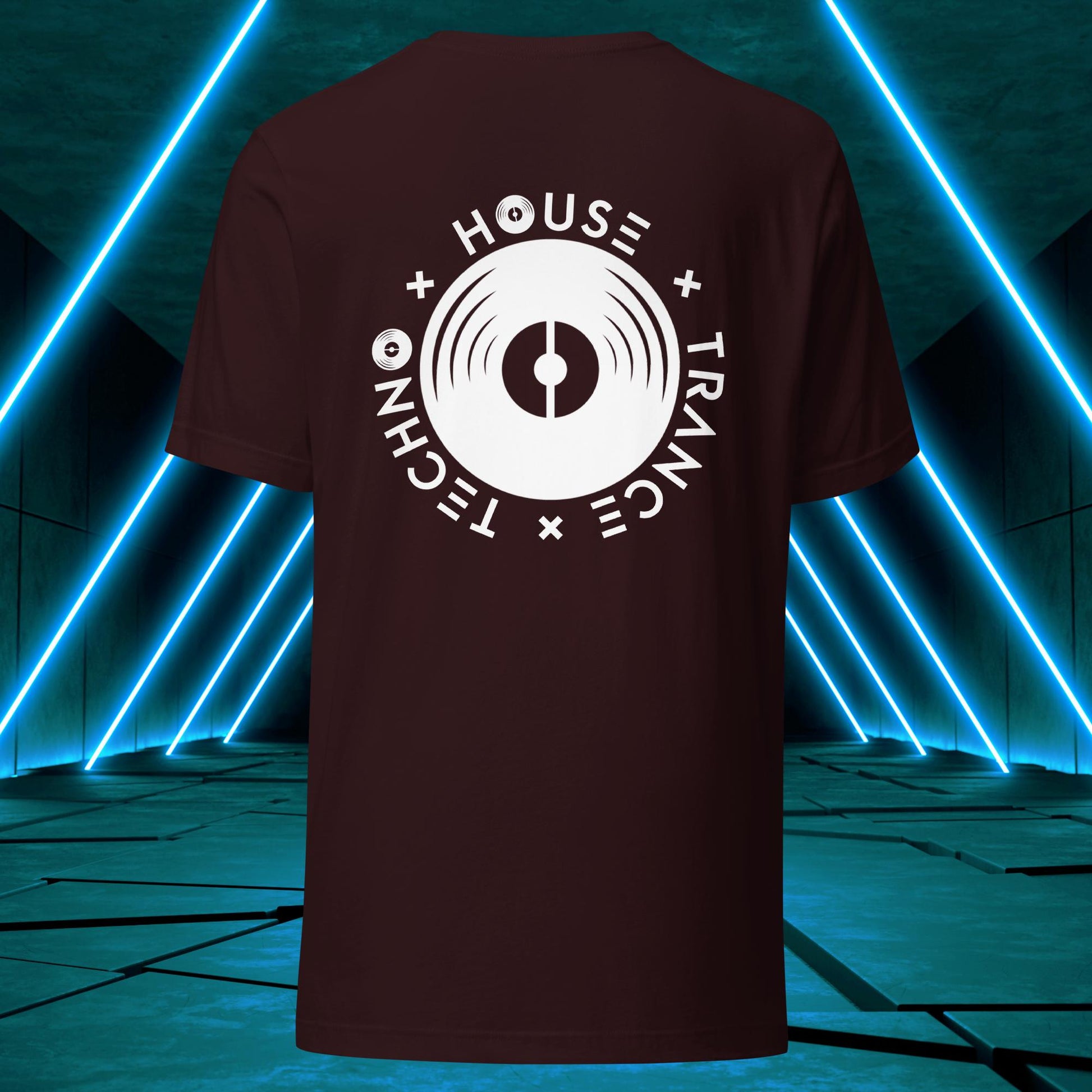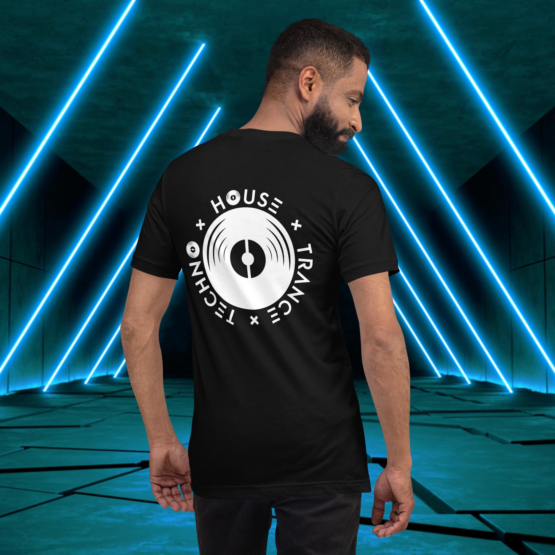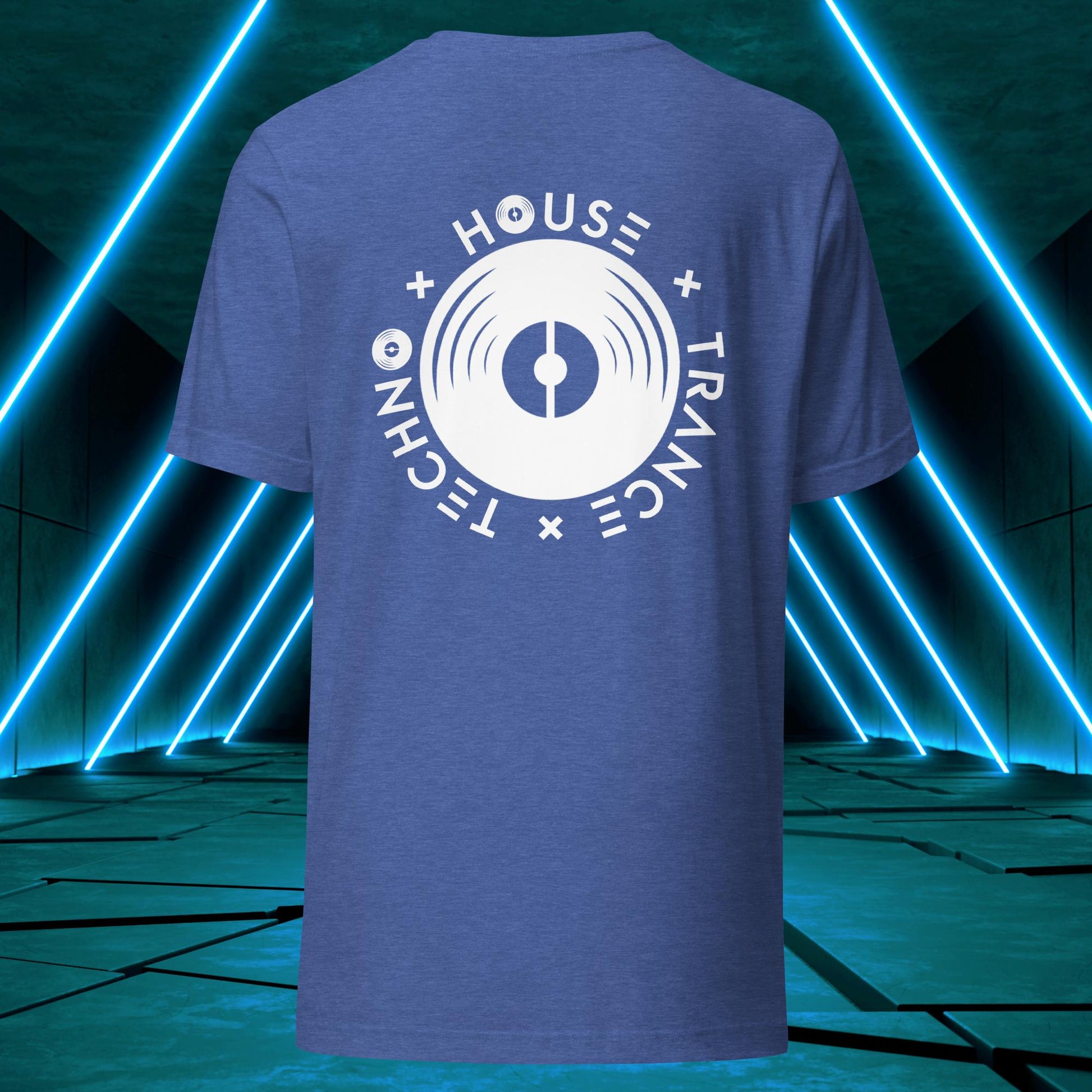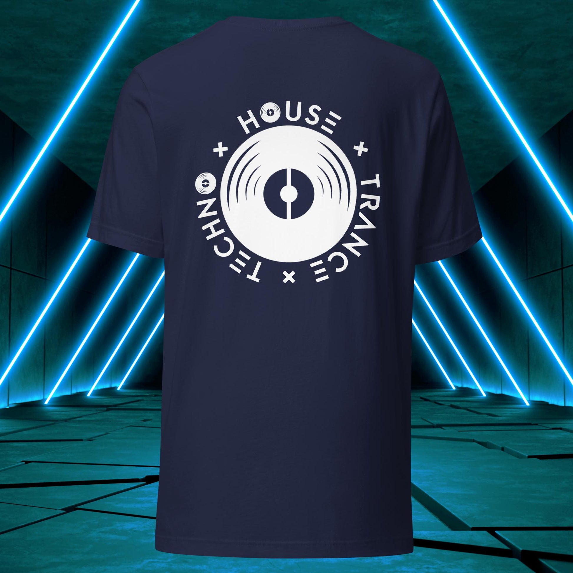 Featuring a sleek and modern design, this t-shirt showcases Elation's emblem on the back, with the words "House," "Techno," and "Trance" integrated into the design elements surrounding a vinyl disc just as one surrounds themself with such music to find wholesomeness in life!