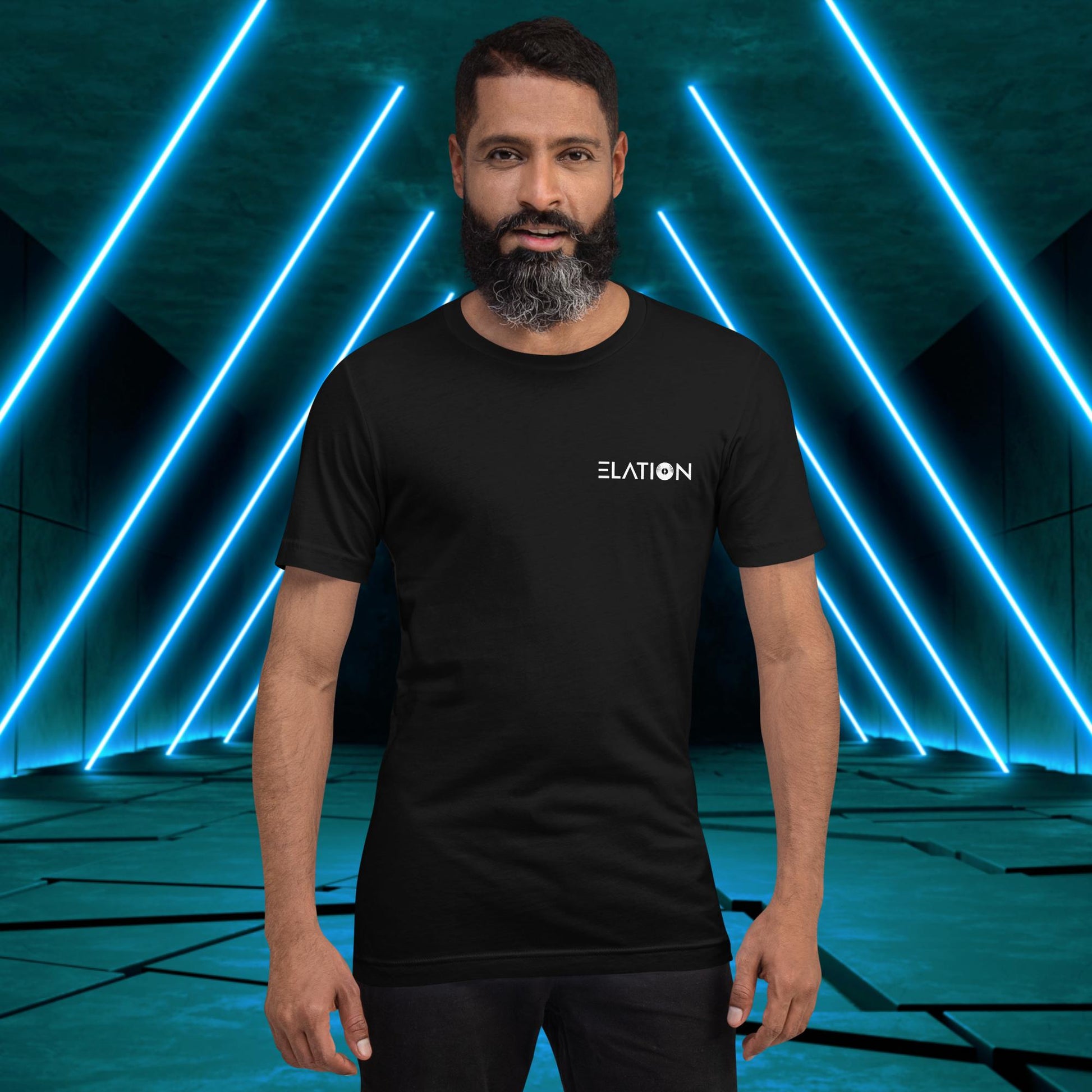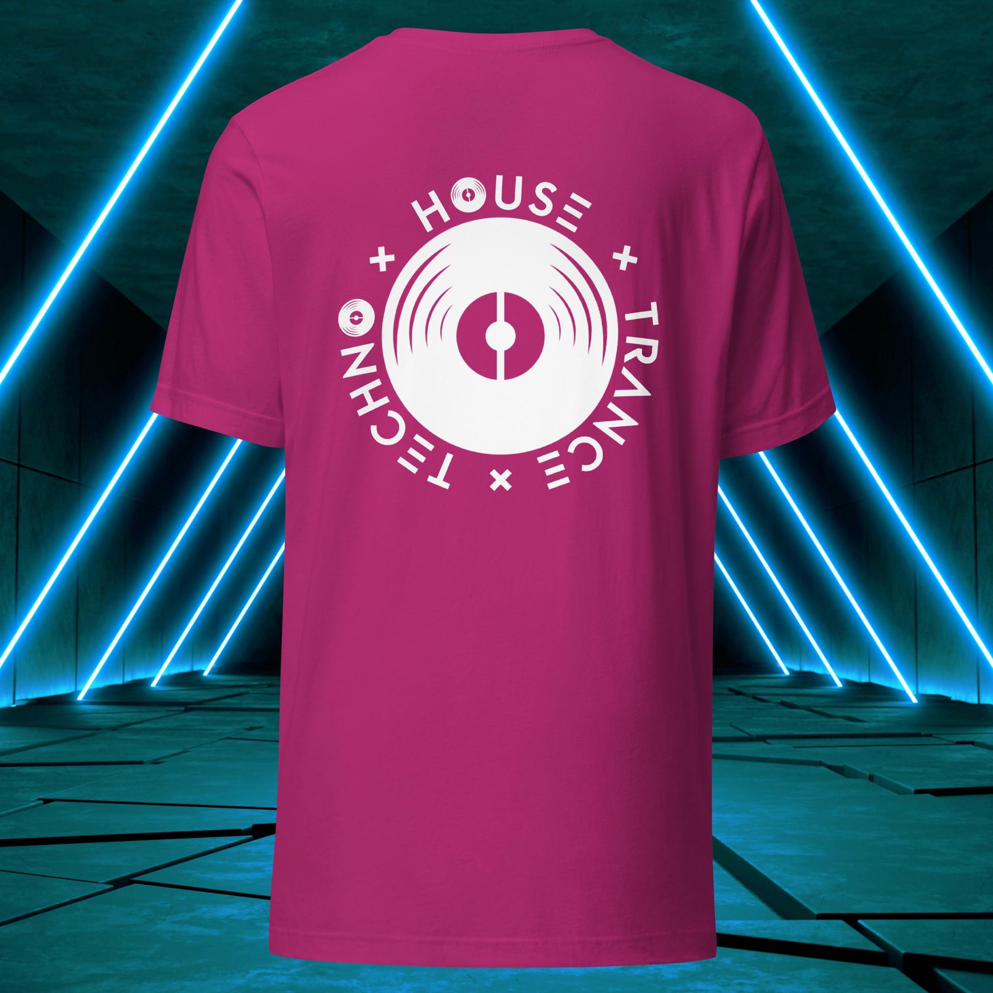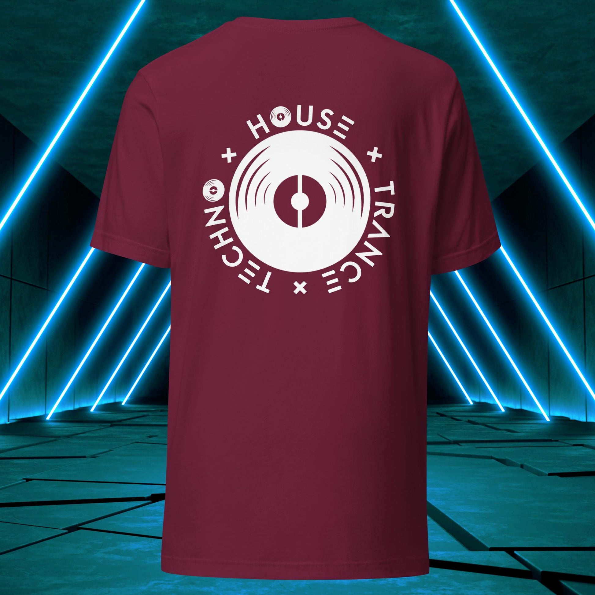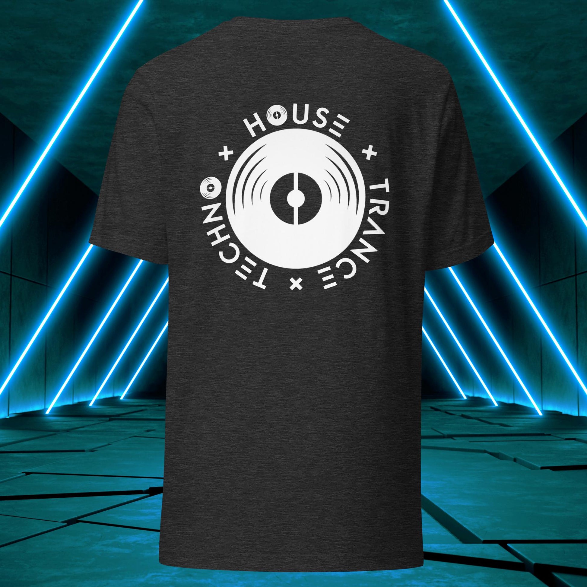 Featuring a sleek and modern design, this t-shirt showcases Elation's emblem on the back, with the words "House," "Techno," and "Trance" integrated into the design elements surrounding a vinyl disc just as one surrounds themself with such music to find wholesomeness in life!