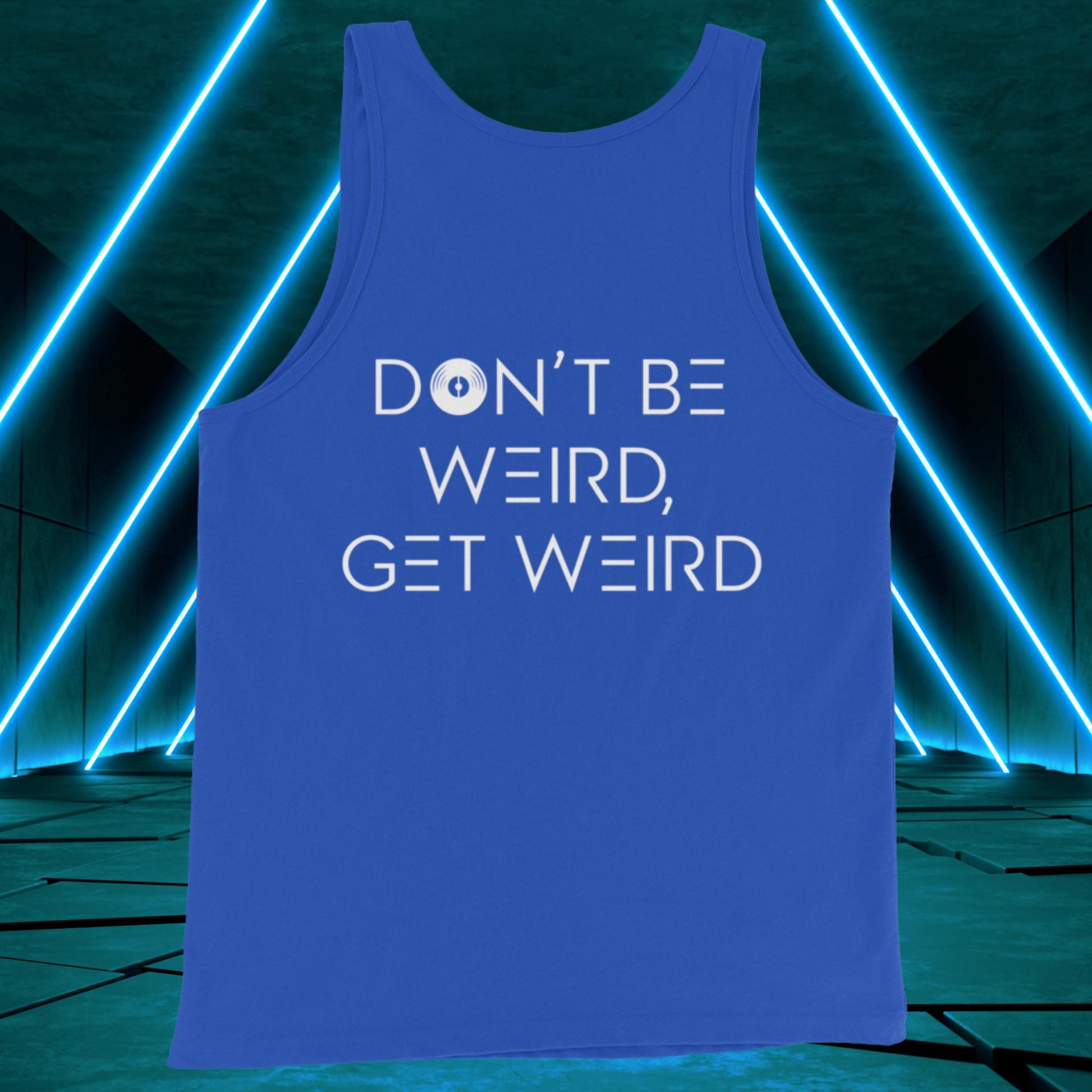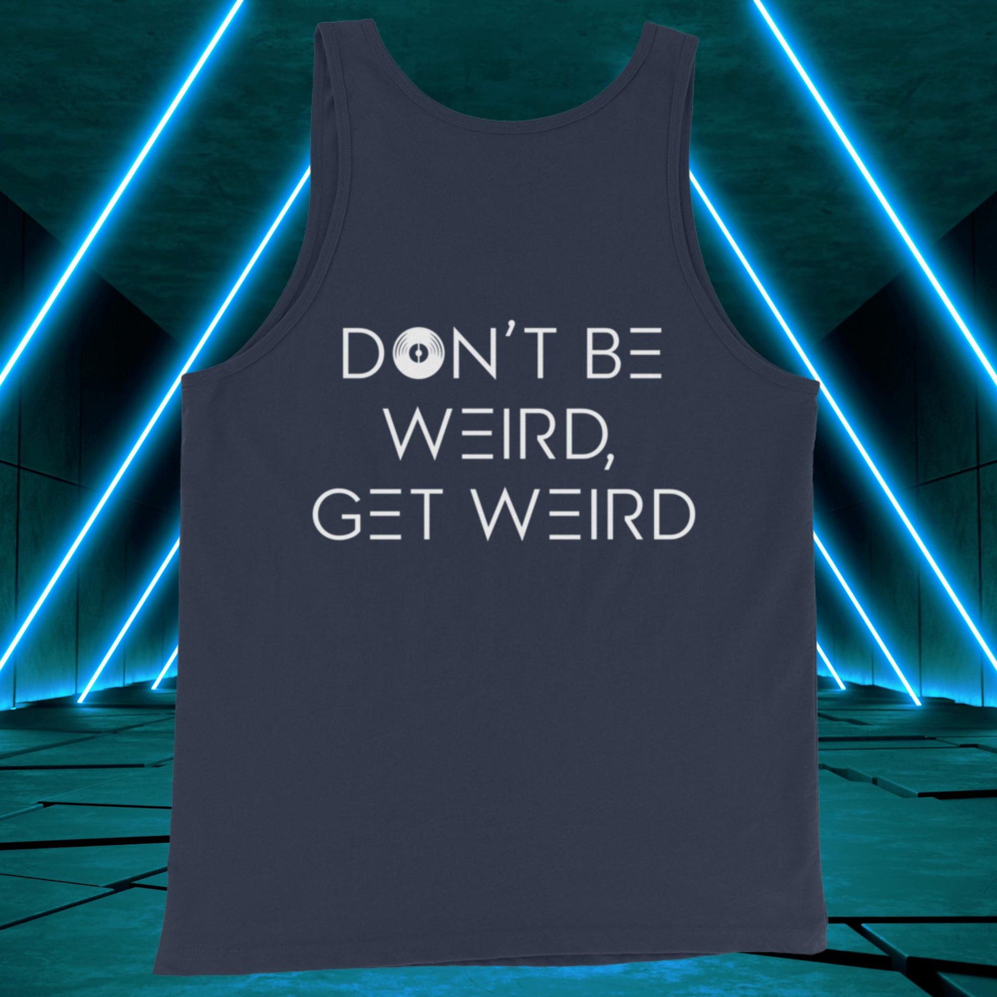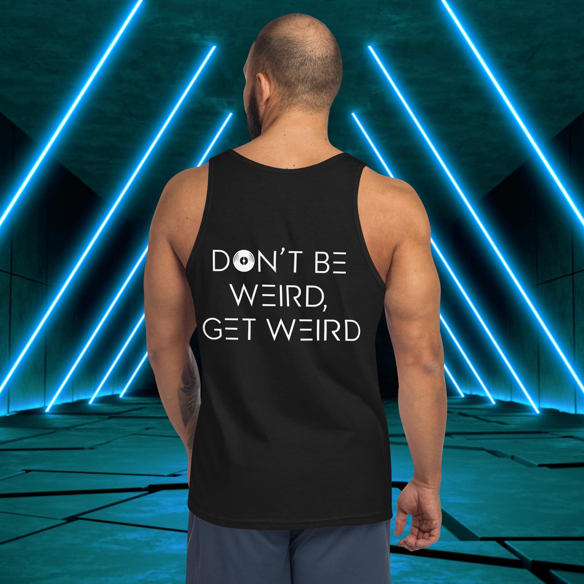 Embrace your eccentric side with the Men's Don't Be Weird, Get Weird Tank Top, a bold and playful accessory for those who aren't afraid to let loose and get weird. This tank top features the quirky phrase 'Don't Be Weird, Get Weird' printed across the chest, encouraging you to let your true colors shine.
