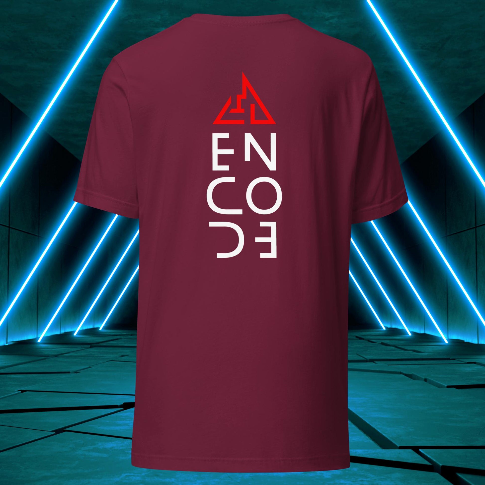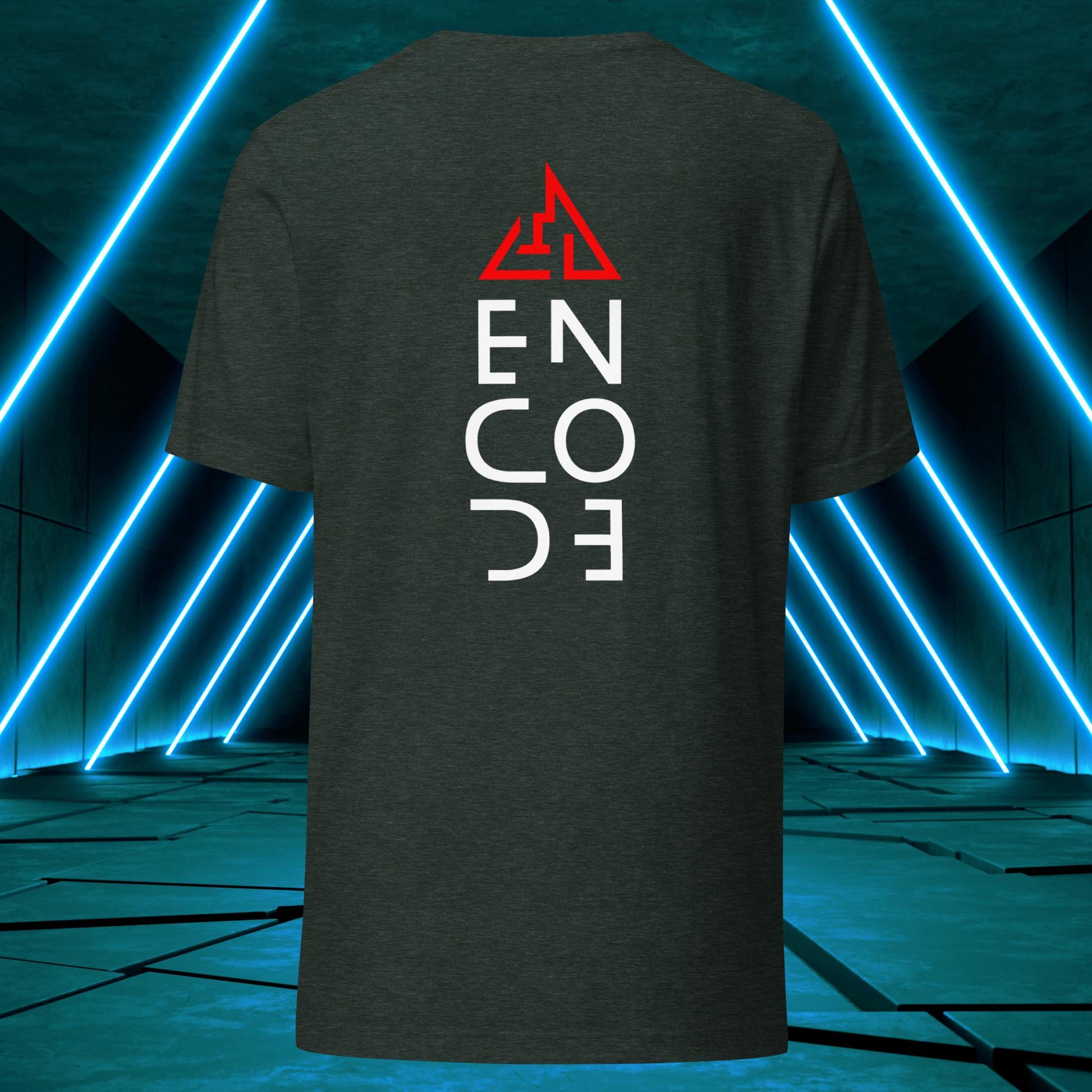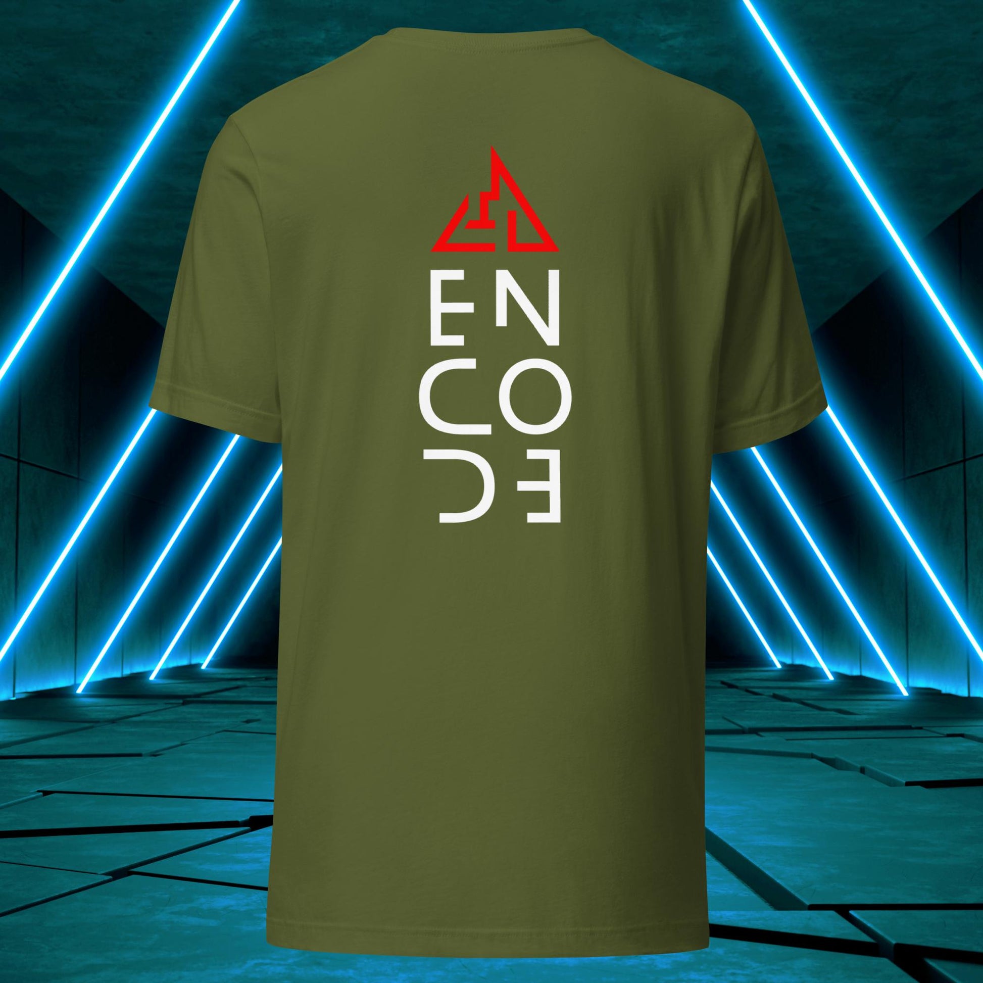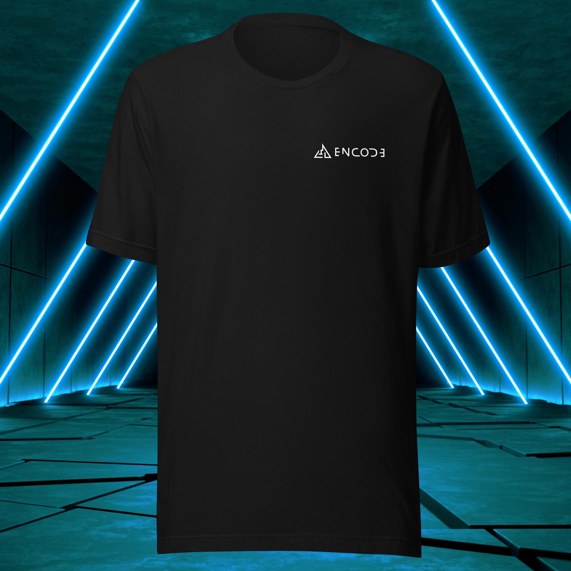 Featuring a clean and minimalist design, this t-shirt showcases the word "Encode" stacked in a style that resembles computer code, with each letter individually highlighting the code to life: Techno.