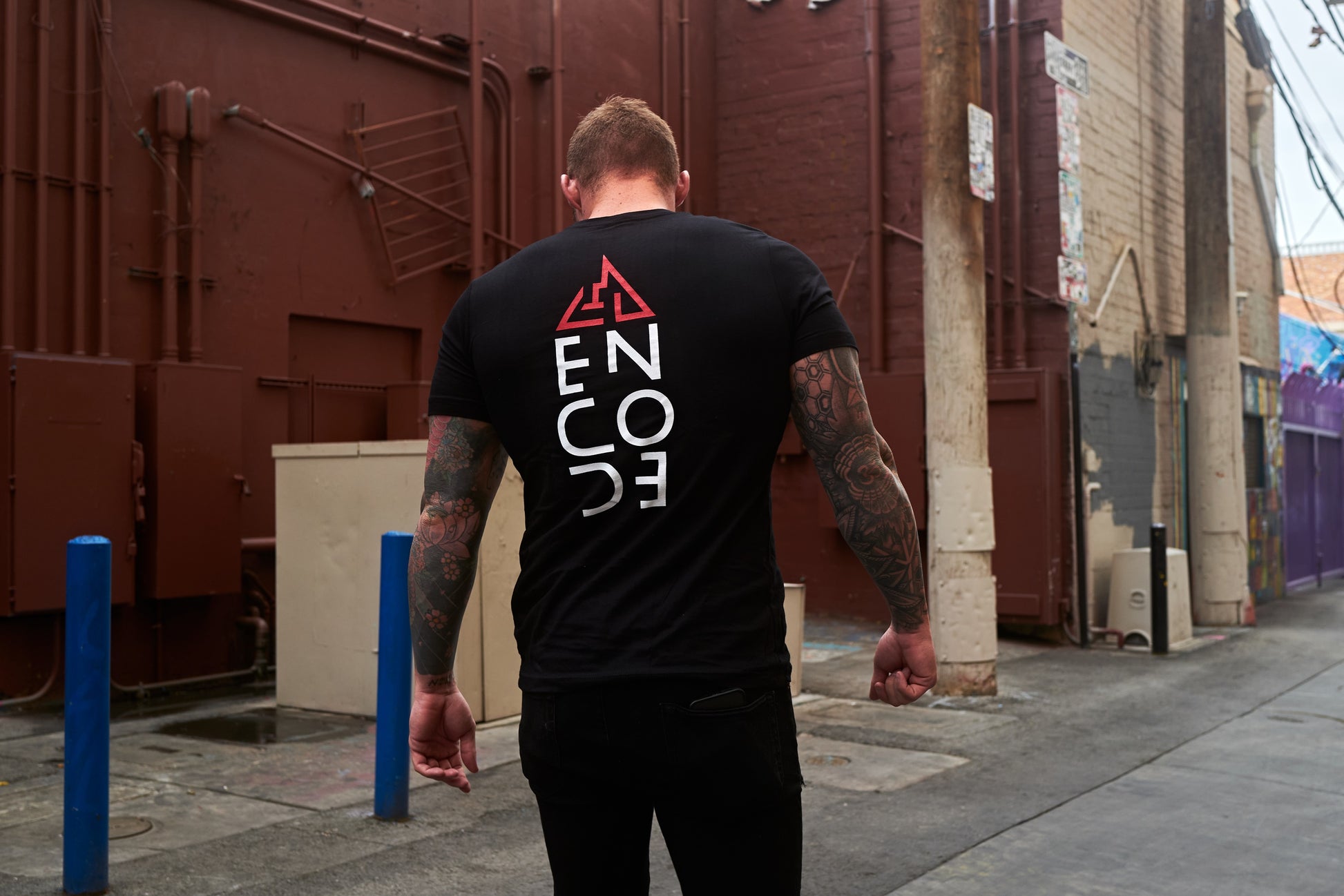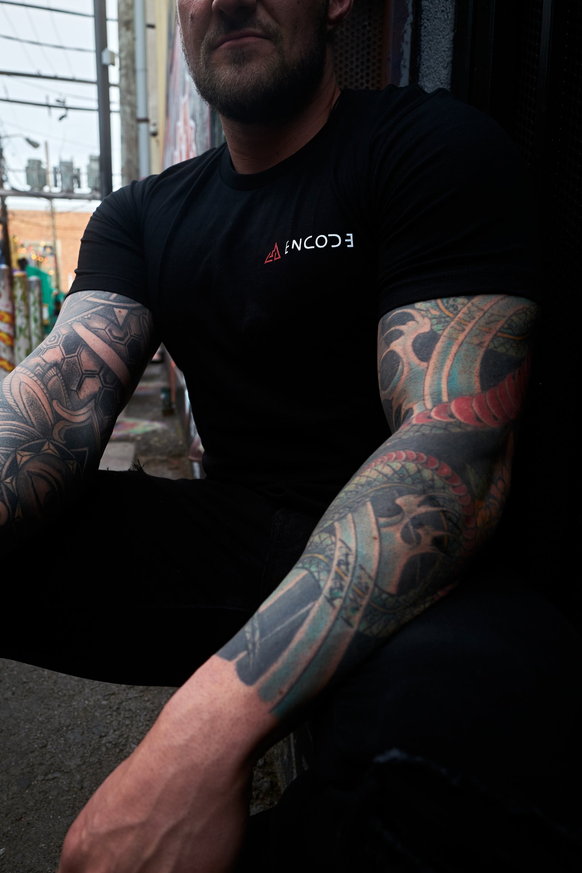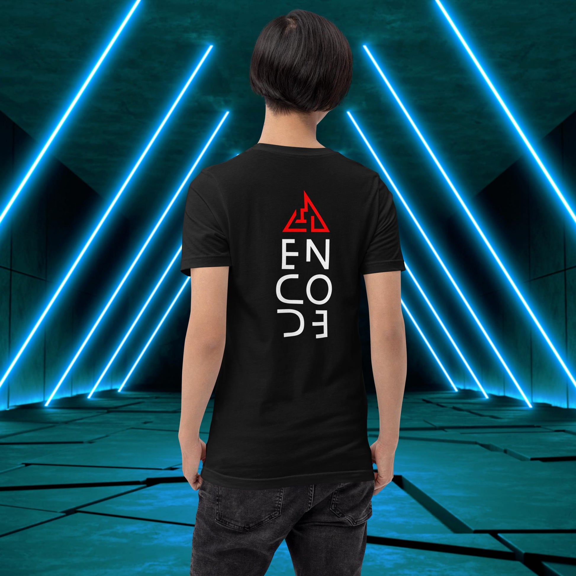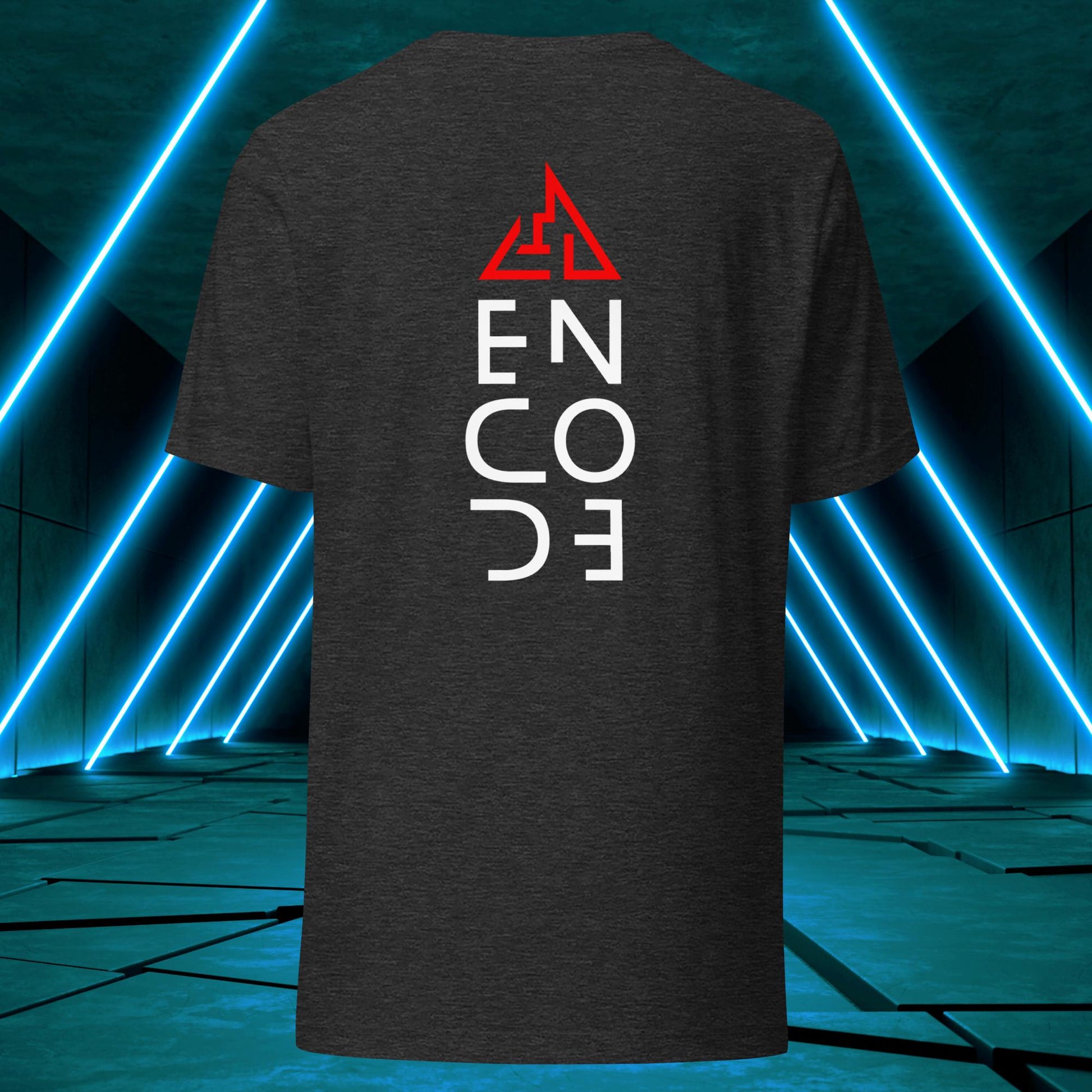 Featuring a clean and minimalist design, this t-shirt showcases the word "Encode" stacked in a style that resembles computer code, with each letter individually highlighting the code to life: Techno.